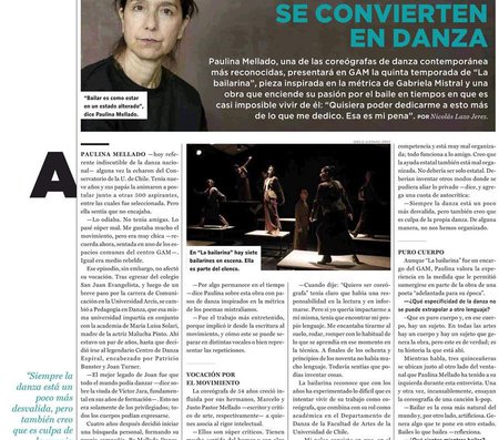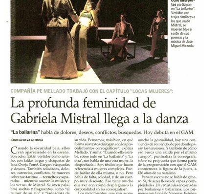 “La bailarina ahora está danzando / la danza del perder cuanto tenía. / Deja caer todo lo que ella había, / padre y hermanos, huertos y campiñas”. Estos son los primeros versos de La bailarina, poema de Lagar que, junto a otras creaciones de Mistral, inspiraron a la coreógrafa Paulina Mellado a crear La bailarina. La obra que se estrenó con éxito el 2015 en GAM y regresa a diez años de ese hito.
