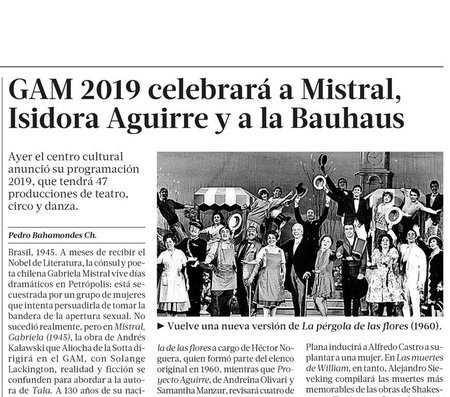 Serán 47 producciones nacionales de artes escénicas que podrá disfrutar el público a partir de marzo de 2019 en las salas y espacios del GAM. Eso sin contar con la programación internacional, las presentaciones musicales, y la gran cantidad de montajes que se dan en el contexto de festivales y ciclos anuales que acoge el centro cultural cada año.