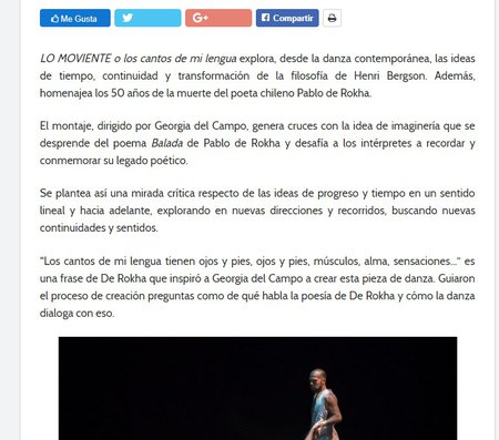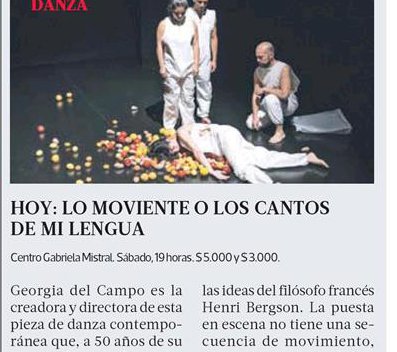 “Los cantos de mi lengua tienen ojos y pies, ojos y pies, músculos, alma, sensaciones…”. La frase es de Pablo de Rokha en su poema Balada. Cincuenta años después de su muerte, ese poema inspiró a Georgia del Campo a crear LO MOVIENTE o los cantos de mi lengua.