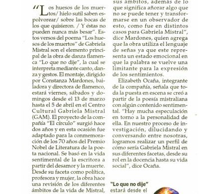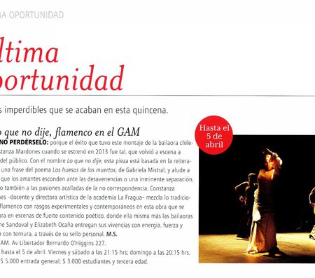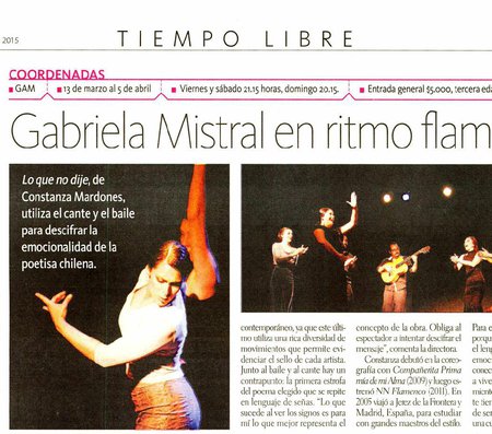 Montaje que mezcla el flamenco tradicional con el de rasgos experimentales y contemporáneos. A través de su creación musical y coreográfica, el montaje aborda la vida afectiva de Gabriela Mistral y la relación que existe entre el Flamenco y la obra literaria. Con escenas de fuerte contenido poético y siempre a través del lenguaje del flamenco, se va dando forma al sentimiento motor de la obra: el desamor.