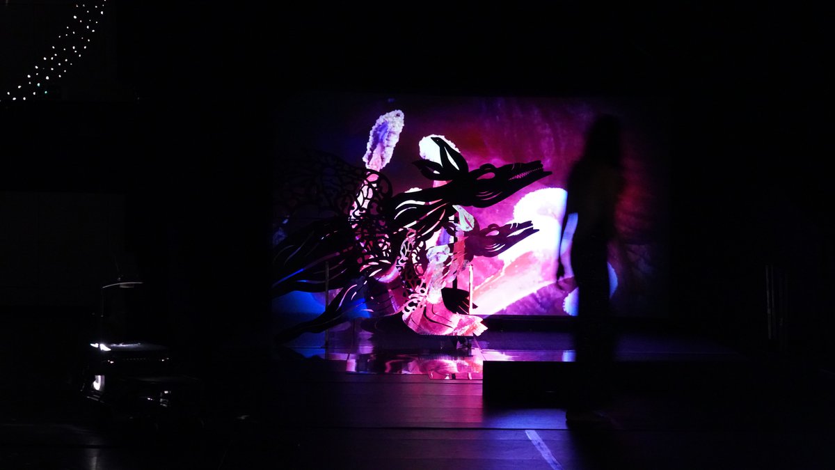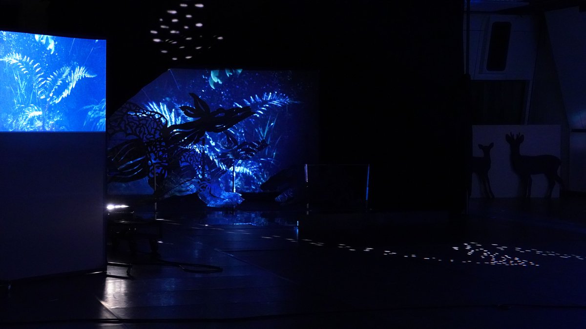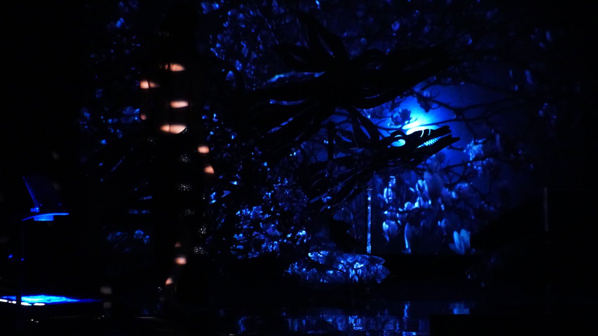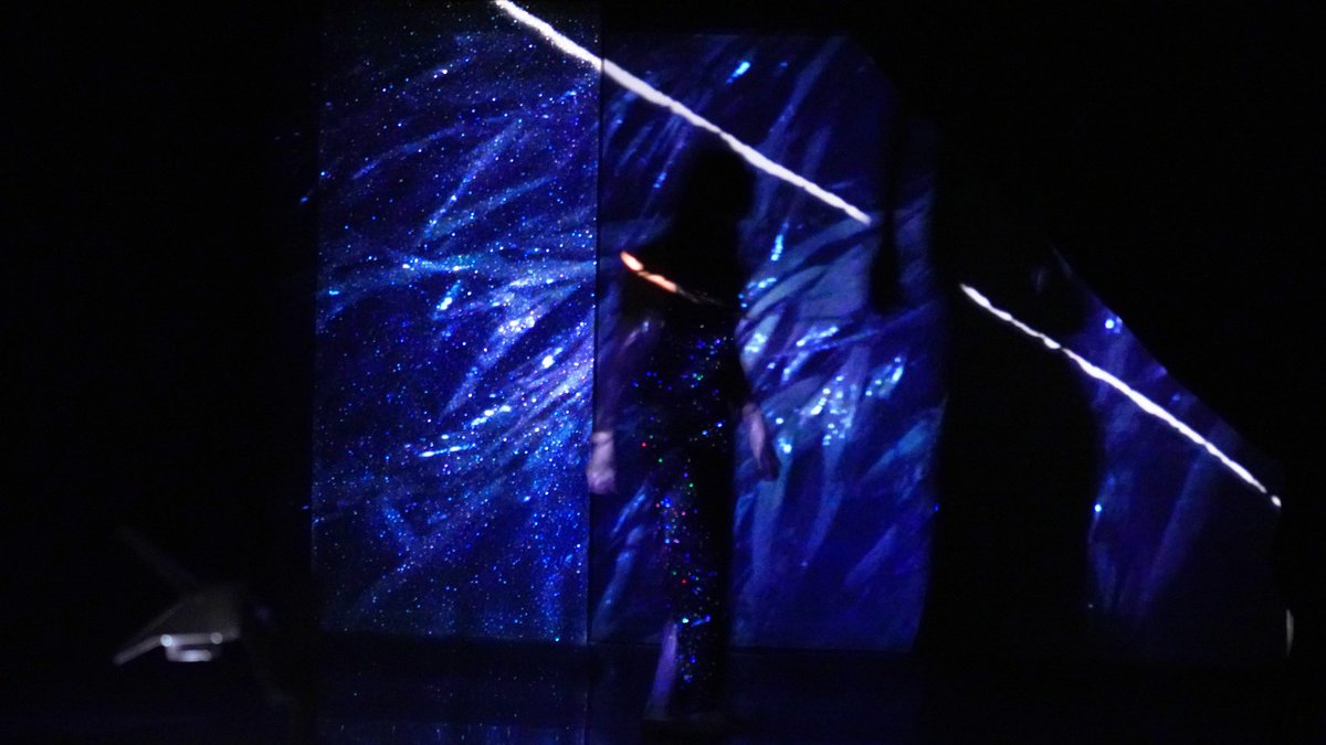 Burbujas de agua, patrones e imágenes revolotean a través de esta instalación sonámbula, en la que baila un solista: una diva de las sombras con un vestido de lentejuelas brillantes.