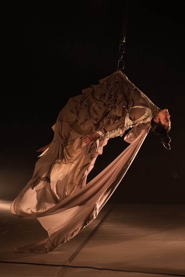 Máquina de Gloria y Olvido plantea un cruce entre las artes vivas, con la interpretación de la performer Belén Ceci y el maniobrista An Devenires bajo la dirección del coreógrafo Marco Ignacio Orellana, director de la Compañía Amateur