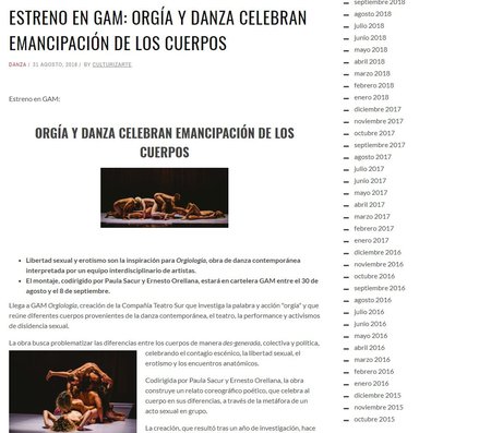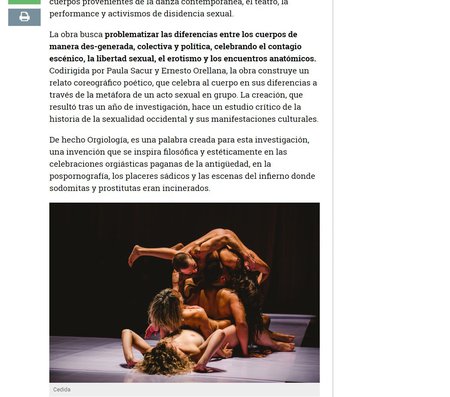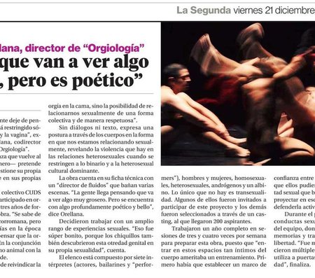 Desde el papel, Orgiología marca la diferencia. Esta creación se enfoca en el cuerpo, desde el discurso, el lenguaje y la estética; indagando en sexo, sexualidad y género. La propuesta revisa la sexualidad occidental grecolatina y precolombina e imagina nuevos rumbos.