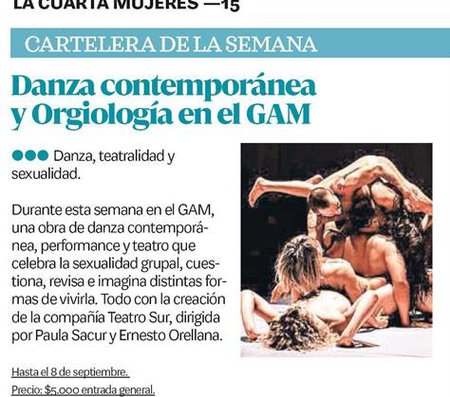 Una obra de danza contemporánea, performance y teatro que celebra la sexualidad grupal, que cuestiona, revisa e imagina distintas formas de vivirla. Una creación de la compañía Teatro Sur, dirigida por Paula Sacur y Ernesto Orellana.