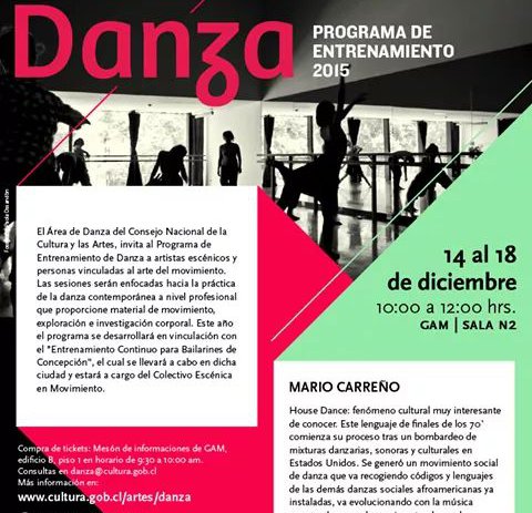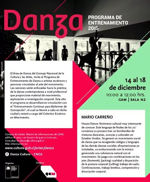 El Consejo de la Cultura, a través de su Área de Danza, en colaboración con el Centro Gabriela Mistral, GAM, invitan a artistas escénicos y personas vinculadas al arte del movimiento a participar en el Programa de Entrenamiento, el cual se desarrollará entre los meses de abril y diciembre del 2015 y contempla la realización de clases de lunes a viernes de 10:00 a 12:00 horas en GAM, a excepción de aquellas semanas que tengan feriados.