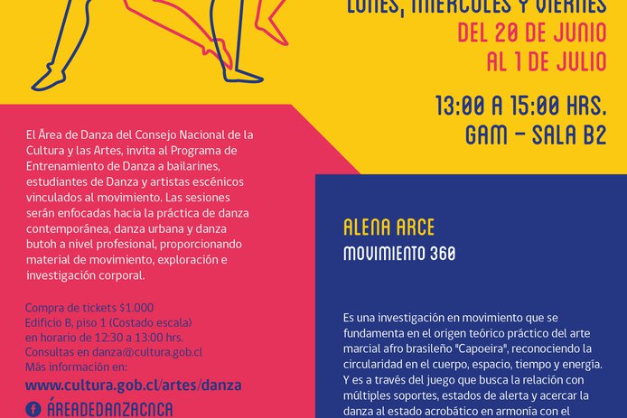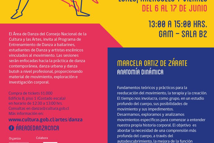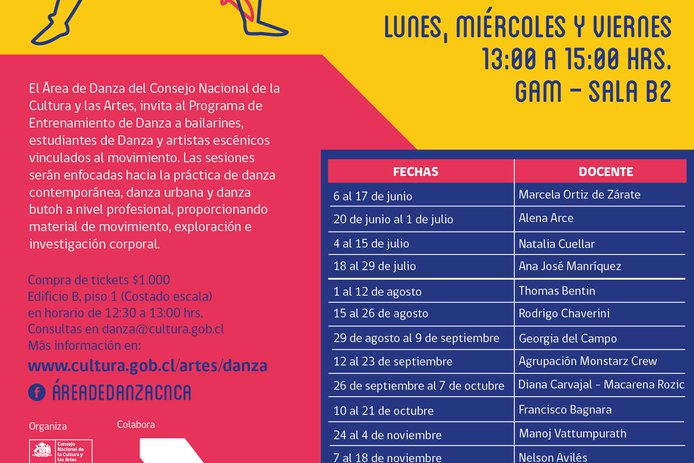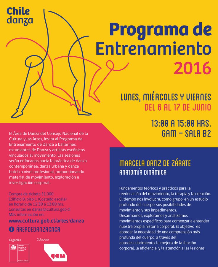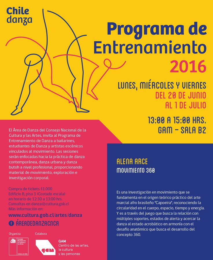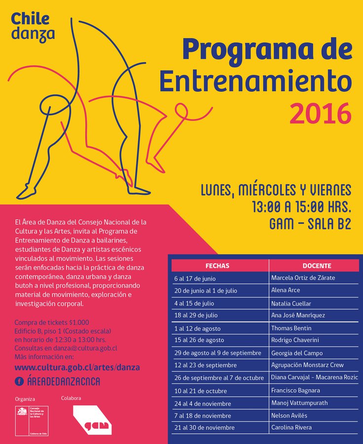 El Consejo de la Cultura, a través de su Área de Danza, en colaboración con el Centro Gabriela Mistral, GAM, invitan a artistas escénicos y personas vinculadas al arte del movimiento a participar en el Programa de Entrenamiento, el cual se desarrollará entre los meses de junio a noviembre de 2016 y contempla la realización de clases los días lunes, miércoles y viernes de 13 a 15 horas en GAM.