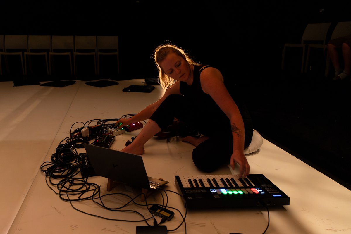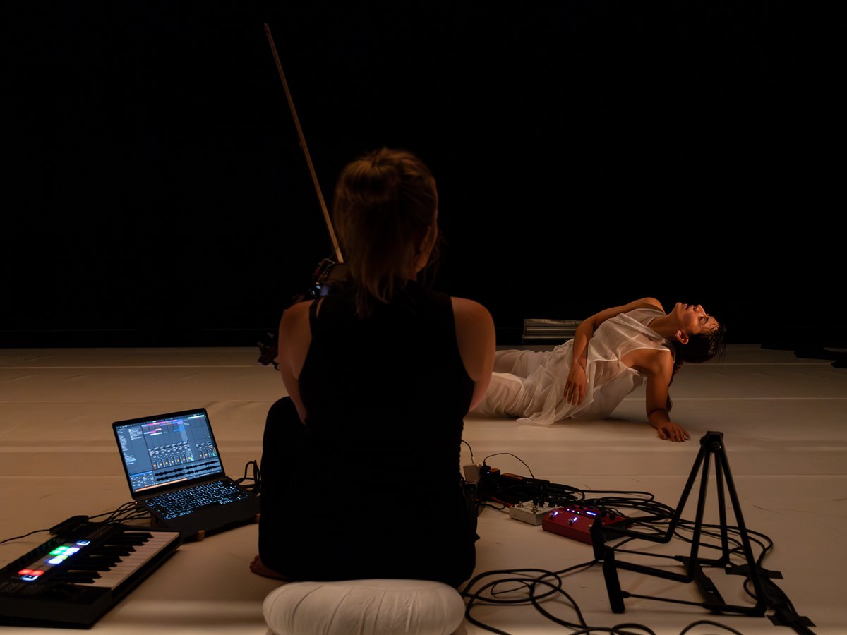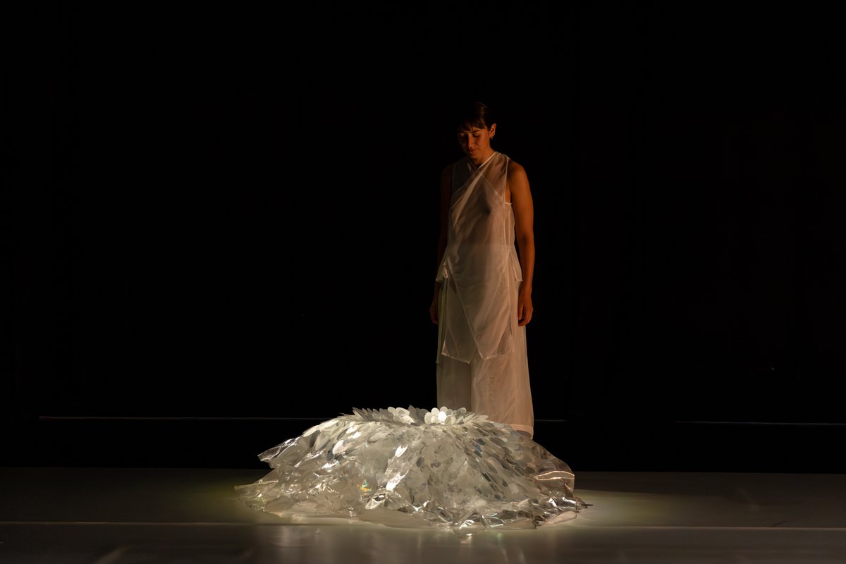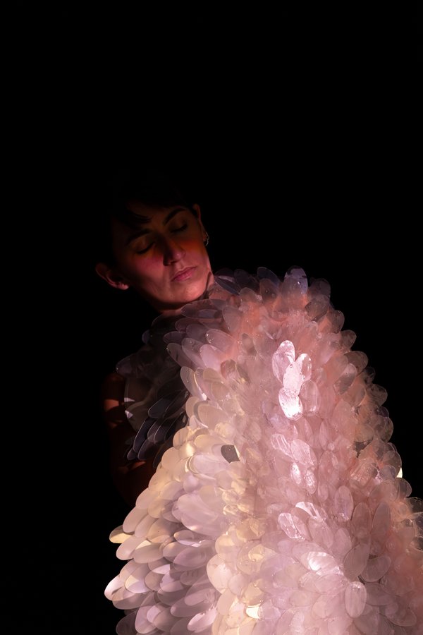 En escena, veremos cómo la luz se materializa en la vestimenta, el espacio, el movimiento, las acciones y el sonido, donde conviven una arquitectura lumínica, un operador de luces con su mesa a la vista, una violista y compositora de música electrónica en vivo, más una performer bailando una colección de prácticas corporales sensibles a la luz.