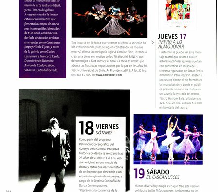 La obra vuelve con elenco nuevo, pero manteniéndose fiel a la original que fue creado en un trabajo de experimentación por cuatro bailarines y un actor y que tenía una banda sonora ecléctica, con tango y sevillana. “Significó un vuelco en términos de lenguaje, buscar en el gesto y el movimiento nuevas posibilidades de expresión”, cuenta Araneda y agrega: “Se alejó de lo que venía haciendo hasta ese momento, de cualquier modo esta transición fue algo inconsciente. Creo que la obra marca un territorio que define toda mi obra, que es conciencia de la memoria dentro de nuestra realidad cultural. Mi trabajo tiene un acento identitario, hablo de mi país siempre, desde nuestra historia”.