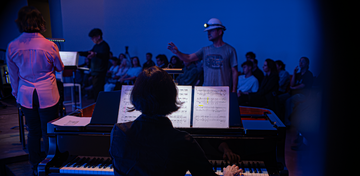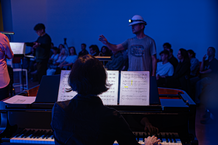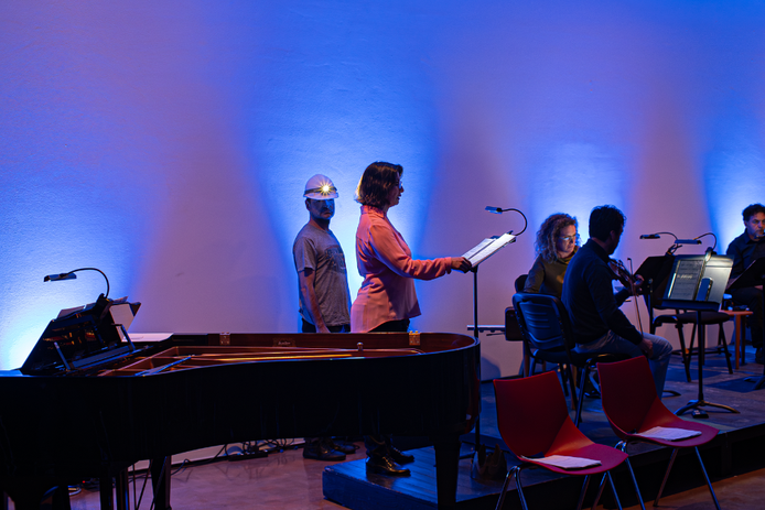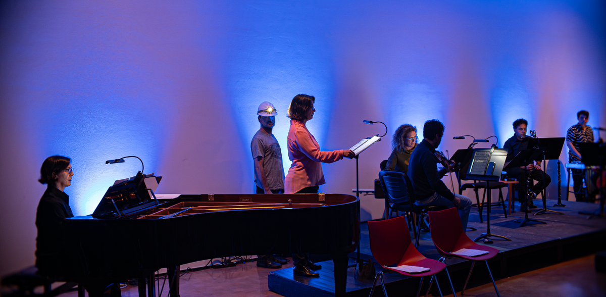 “La mina”, del compositor Rodrigo Herrera, con libreto de Cristián Dittmann y régie de Ignacio Ramírez, está concebida como una escena lírica para soprano y ensamble. Ambientada en un pueblo minero en las alturas de los Andes, la obra presenta a una mujer que llora por la muerte de su esposo producto de una explosión. Ella esconde las lágrimas porque sus hijos no saben y no encuentra el valor para decirles.