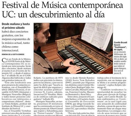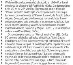 4 Jun: El Cuarteto Académico UC, compuesto por Frida Ansaldi, Gonzalo Beltrán, Penelope Knuth y Alejandro Tagle, interpretarán un concierto titulado “La mujer en el cuarteto”. Las obras serán Tres piezas Op. 5 para cuarteto de cuerdas de Alicia Terzian, Cuarteto de cuerdas de Leni Alexander y Cuarto de cuerdas Op. 6 en mi bemol mayor de Johanna Müller-Hermann.