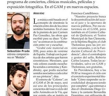 Tres conciertos trae a GAM el 5to Ciclo de Jazz Animales en la Vía. Carmen Paz Cuarteto Sudamericano lanza su disco Colores el jueves 26 de mayo, liderados por la pianista Carmen Paz González y con la participación especial de Francesca Ancarola y Alfredo Tauber. El viernes 27 se presenta Roberto C. Lecaros Quinteto. Y el sábado 28,Natalia Ramírez Quinteto presenta su primer disco, con Bernardita Fiorentino y Junior Laniyan como invitados.