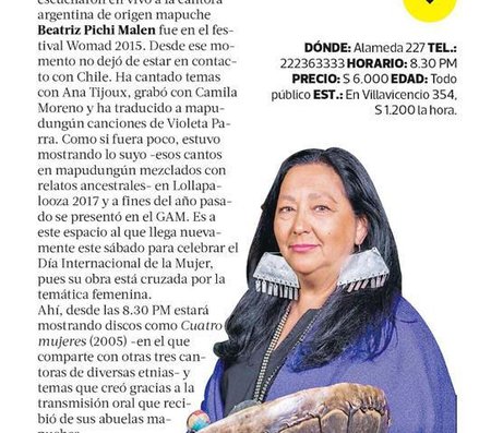 Argentina de nacimiento, Beatriz ha dedicado su trabajo artístico por más de 30 años a la búsqueda, rescate y difusión de la cultura de su pueblo, el Puelmapu, o territorio argentino.