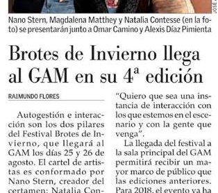 Luego, Brotes de Invierno se trasladará al GAM durante dos días. Para el viernes 31 de agosto están programadas las presentaciones de Marta Gómez, Nano Stern, Manu Sija y Los Celestinos; mientras que el sábado 1 de septiembre el cartel considera a Marta Gómez, Nano Stern, Manu Sija y Elizabeth Morris.