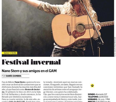 Nano Stern, Marta Gómez (Colombia), Manu Sija (Argentina), Benjamín Walker, Vicente Cifuentes, Los Celestinos y Elizabeth Morris, son los artistas que darán vida a la quinta versión del Festival Brotes de Invierno, un evento impulsado por Stern.