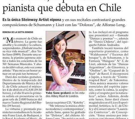 El programa de Yuko Sano incluye obras de Robert Schumann, Alfonso Leng, Fabián Andrades, Toru Takemitsu, Franz Liszt, Maurice Ravel y Alberto Ginastera. La intérprete se graduó de la Universidad de las Artes de Tokio y realizó estudios de postgrado en Royal Academy of Music. Se ha presentado en importantes escenarios internacionales y en el año 2014 se convirtió en la primera pianista japonesa en ser nombrada Joven Artista Steinway.