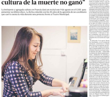 La pianista María Paz Santibáñez, realizó sus estudios de piano en la facultad de Artes de la Universidad de Chile con el pianista Galvarino Mendoza (1928-2009), su padre musical. Su formación continúa en República Checa con el profesor de la Academia de Música de Praga, Jaromír Křiž. En 1999, luego obtener su Licencia de Interpretación superior mención Piano en la Universidad de Chile, se instala en París, Francia, para seguir estudios de perfeccionamiento. En esta ciudad obtiene el Diplôme d’Exécution en la Ecole Normale de Musique de París Alfred Cortot en 2001, bajo la dirección de Odile Delangle.