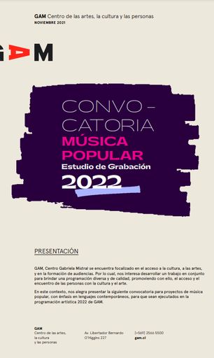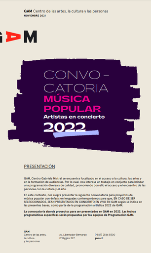 GAM, Centro Gabriela Mistral se encuentra focalizado en el acceso a la cultura, a las artes, y en la formación de audiencias. Por lo cual, nos interesa desarrollar un trabajo en conjunto para brindar una programación diversa y de calidad, promoviendo con ello, el acceso y el encuentro de las personas con la cultura y el arte. En este contexto, nos alegra presentar la siguiente convocatoria para proyectos de música popular, con énfasis en lenguajes contemporáneos, para que sean ejecutados en la programación artística 2022 de GAM.