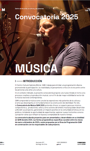 GAM comprende la música como una de las expresiones más potentes de la cultura y el arte que desempeña un rol fundamental en la construcción de identidad. Por ello, la Convocatoria de Música GAM 2025 pretende ofrecer un espacio para que músicos, compositores y , productoras, sellos y otros actores del ámbito musical puedan desarrollar y difundir sus proyectos, generando un impacto positivo en la comunidad artística y en los públicos, brindando la oportunidad de experimentar, explorar nuevos horizontes sonoros y proponer obras que reflejen la riqueza y complejidad de nuestro tiempo.