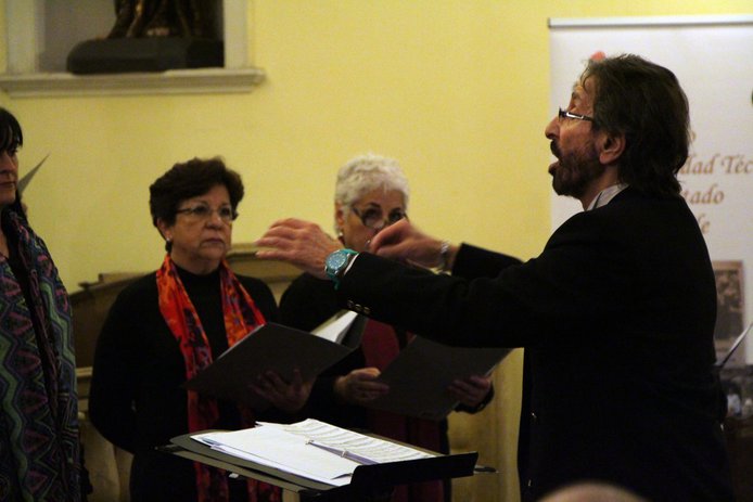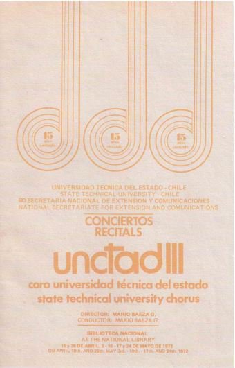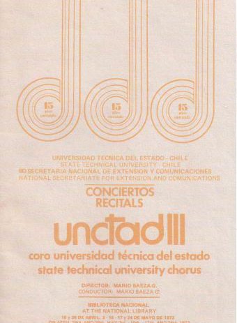 1972. El Coro de la Universidad Técnica del Estado, dirigido por Mario Baeza, da un concierto como parte de la Conferencia de las Naciones Unidas sobre Comercio y Desarrollo (Unctad III) que se desarrolla en el edificio que hoy alberga a GAM. Ahora bajo la dirección de Fernando Farizo, siete de los cantantes que integraron el coro en 1972 junto a otros once músicos que formaron parte de la agrupación en otros periodos darán el concierto De lo sacro a lo profano, que incluye siete piezas que fueron parte de su repertorio 1972, entre ellas composiciones de Henry Purcell y Tomás Luis de Victoria.