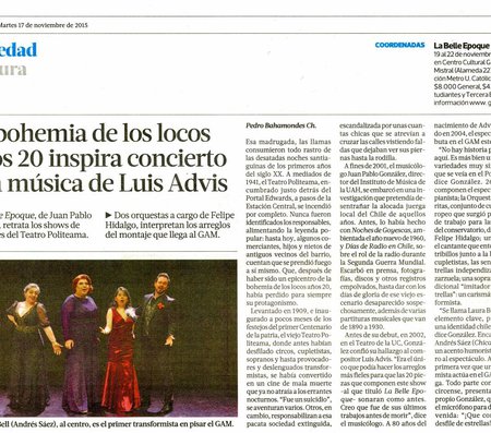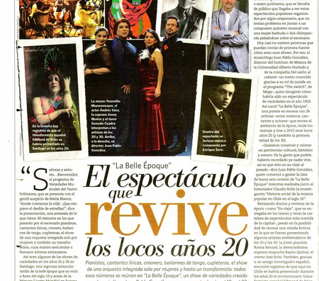 Esos años de efervescencia y de una eclosión de bailes de salón inspira a La Belle Epoque, espectáculo dirigido por el musicólogo de la Universidad Alberto Hurtado (UAH), Juan Pablo González, donde retoma el recorrido por la entretención santiaguina que ya antes hiciera con Noches de Goyescas, ambientada el año nuevo de 1960, y Días de Radio en Chile, con el rol de la radio durante la Segunda Guerra Mundial.