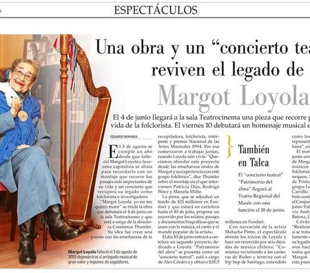 Danza, música, teatro y audiovisual. El legado de Margot Loyola como folklorista e investigadora protagoniza este concierto interdisciplinario que incluye obras de su repertorio y parte de sus recopilaciones de música y danza.
