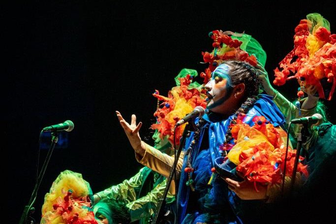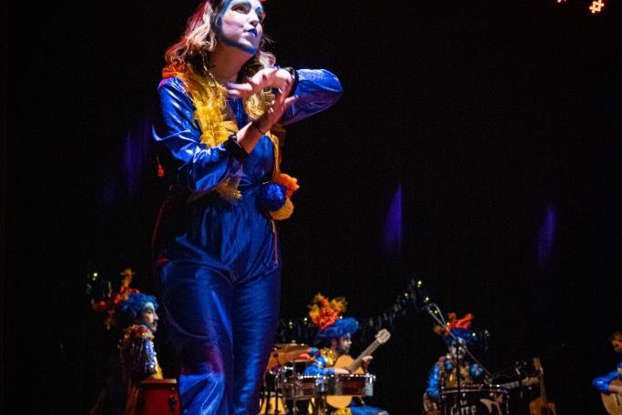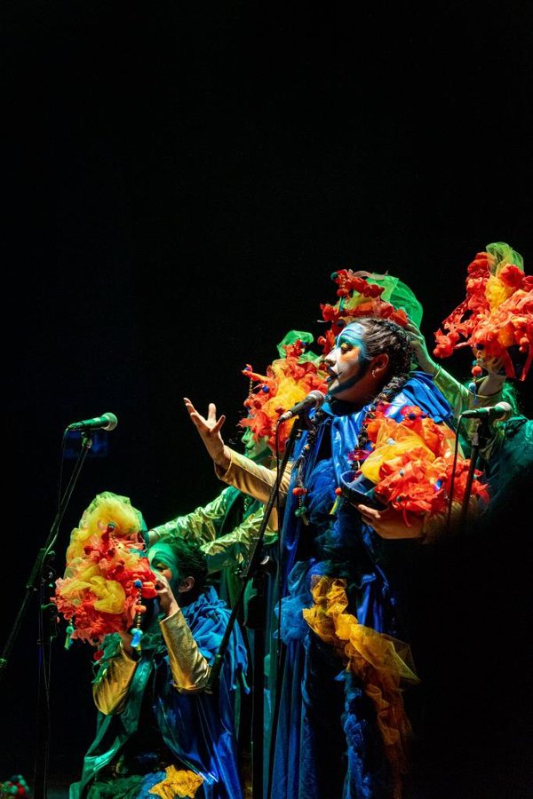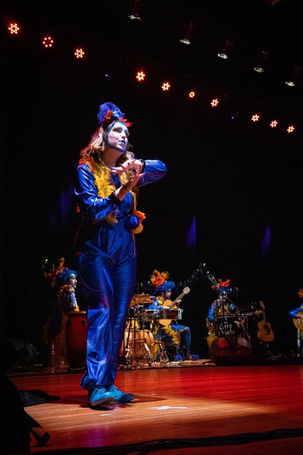 Influenciada por el carnavalesco tenor de las murgas uruguayas, la compañía chilena despliega un multicolorido encuentro de música, trajes, así como maquillajes, que condensa poesía, reflexión, más crítica social, a través de vals peruano, candombe, cantata, tonada, cueca, bolero, salsa y joropo, entre otros estilos de raíz popular latinoamericana.