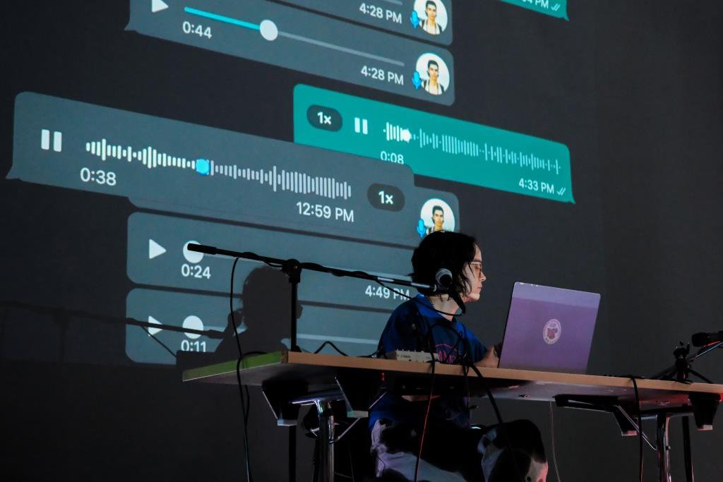 “Desde hace un par de años soy consciente de que guardo trozos de voces incorpóreas en mi teléfono, dentro de mi bolsillo. Voces en un proceso inmortal de devenir. Inmortales mientras mantenga a salvo mi teléfono y mi portátil. Y me pregunto si estoy empezando a desarrollar una relación afectiva con mis dispositivos”, se cuestiona la artista Juliana Castro Duperly (CO) en torno a su performance “Aliento Líquido”.