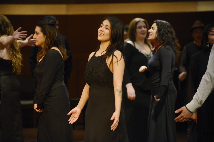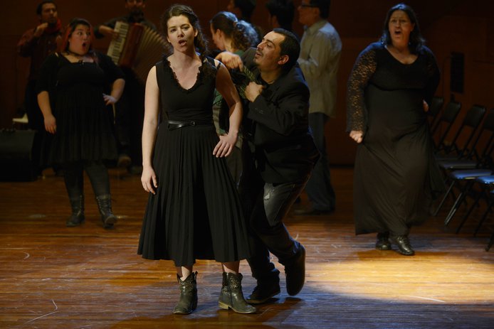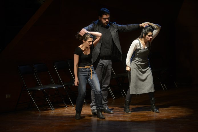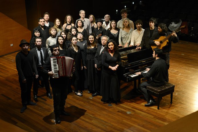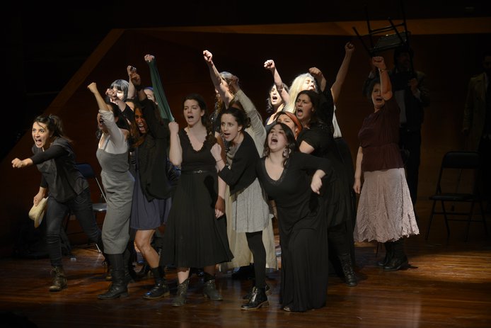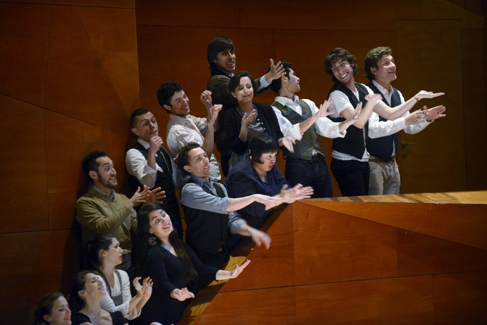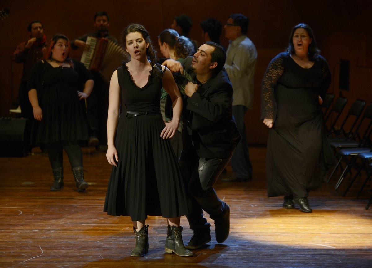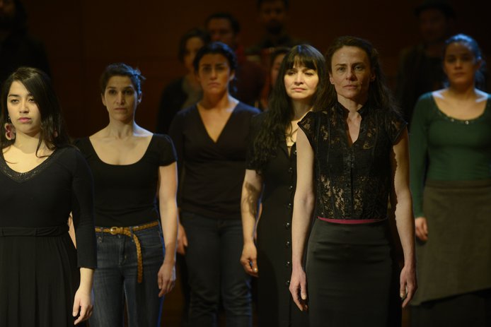 Descendiendo las escaleras, una murga de 40 intérpretes –uno por cada año que ha pasado desde el golpe militar– entra en escena entonando Canto libre. Cinco familiares de ejecutados políticos, cinco músicos y 30 actores representan la cantata que recoge la figura de Víctor Jara y el presente de sus asesinos, para hablar de tantas otras víctimas de la dictadura.
