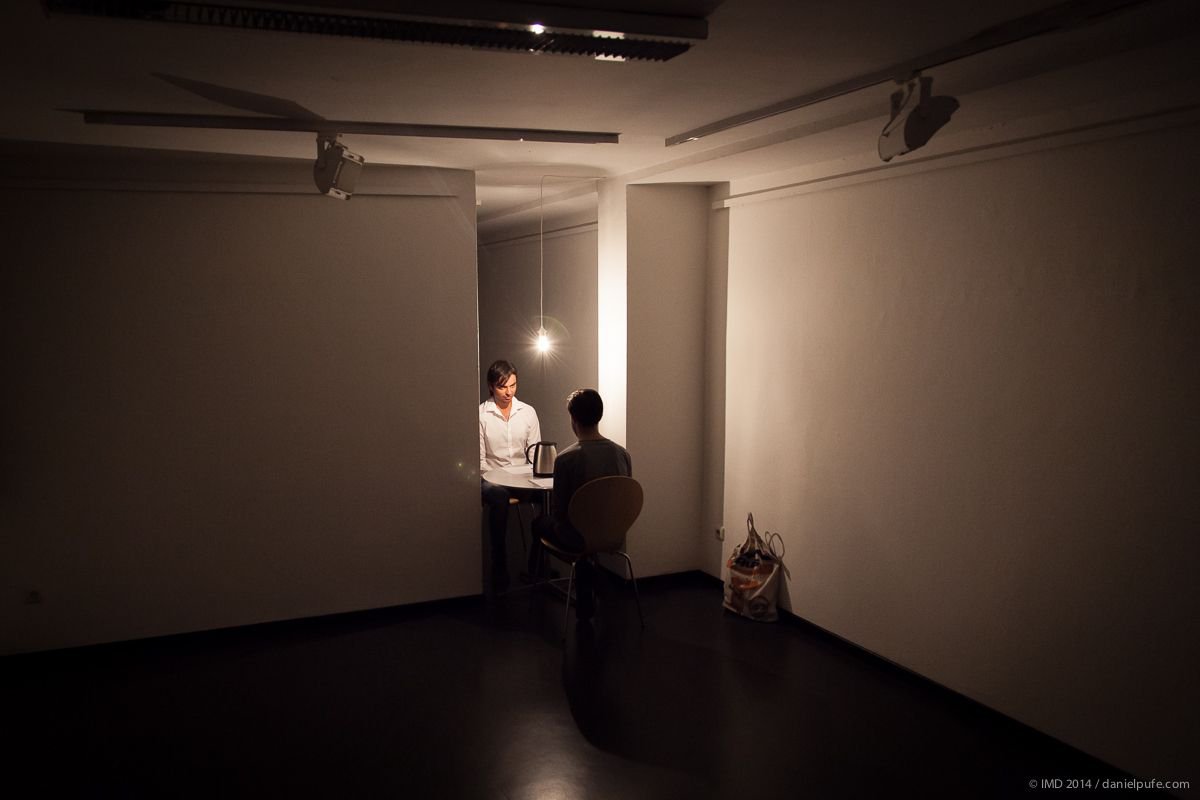 Performance interactiva privada e individual. En la soledad del teatro, y sentado frente a un computador que contiene una interfaz de usuario especialmente creada para la obra, el participante puede escoger y operar diversos elementos de la puesta en escena: iluminación, sonido, música e imágenes.