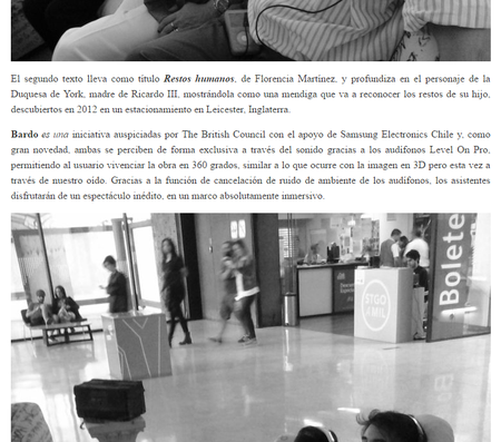 Este texto es uno de los dos que forman Bardo, un viaje sonoro por el mundo de Shakespeare, una experiencia de teatro sonoro dirigido por María Jesús González e interpretada por José Soza y María Elena Duvauchelle. La otra obra es Restos humanos, de Florencia Martínez, que profundiza en el personaje de la duquesa de York, madre de Ricardo III, situándola como una mendiga que va a reconocer los restos de su hijo, descubiertos el 2012 en un estacionamiento en Leicester. Bardo…, auspiciado por The British Council, se percibe exclusivamente a través del sonido, con audífonos y los ojos vendados.