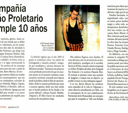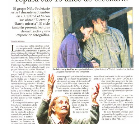 Remontaje que conmemora los 10 años de trabajo artístico de Teatro Niño Proletario, cuya investigación ha estado centrada en la búsqueda de fracturas sociales que revelen la identidad de los marginados.