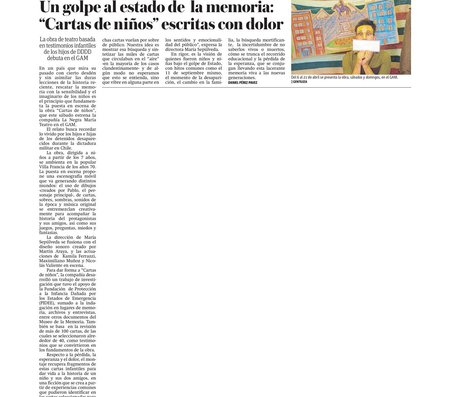 Cartas de niños se sitúa en dictadura, en un espacio que simula un tendedero en una villa de esos años. La puesta en escena dirigida por María Sepúlveda busca crear escenas sensoriales y poéticas con objetos sencillos, muñecos, gestualidad, sonidos de la época y música original. La obra fue creada con el patrocinio de fundación PIDEE y la Corporación Cultural de la Reina.