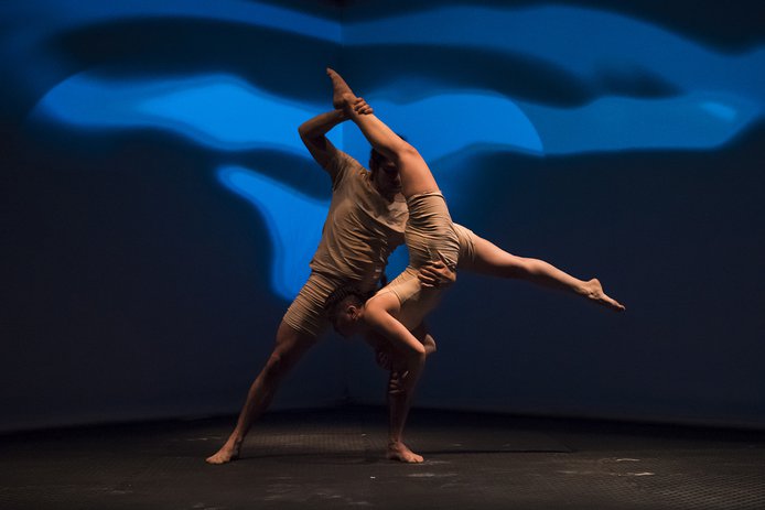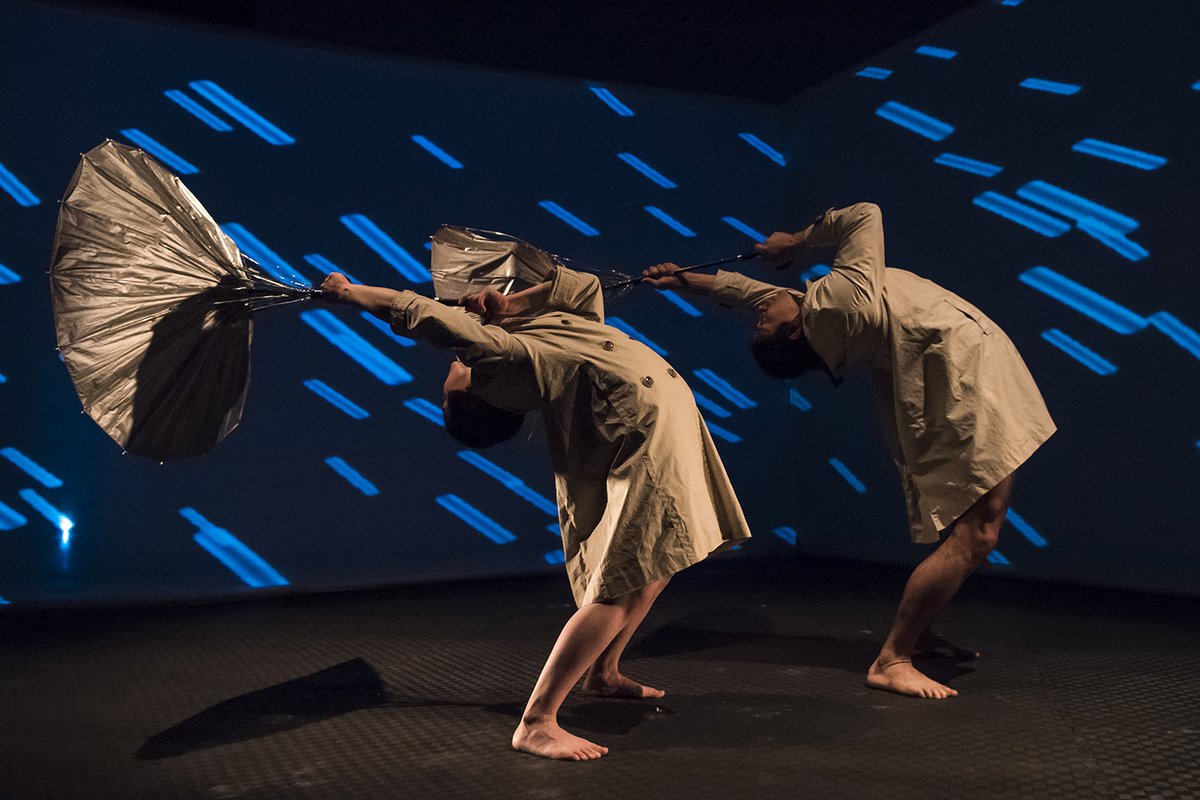 Dos artistas interactúan con dos grandes pantallas que envuelven el escenario. La tecnología es un elemento central en Ecosofía, obra de circo contemporáneo que aborda las relaciones entre naturaleza y humanidad.