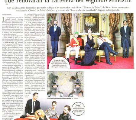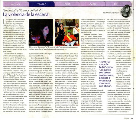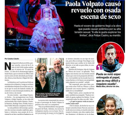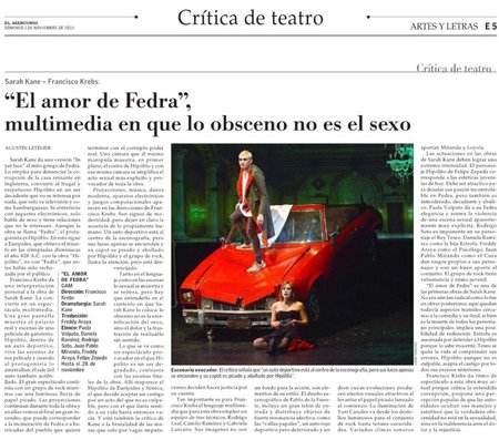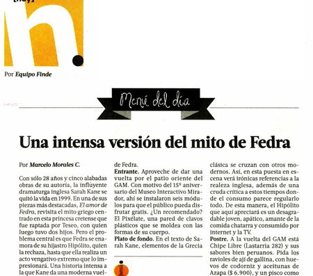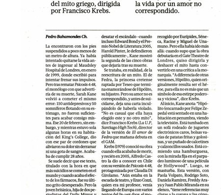 Una comedia sobre amor, fe y depresión, así describió la misma Kane a esta obra. La dramaturga actualizó el texto incluyendo referencias a la familia real inglesa, retratando un mundo consumista, viciado y vacío, corrompido por el poder, el deseo y la violencia. Y aunque el texto tiene casi 20 años, a Krebs le parece que sigue funcionando como una metáfora de los desequilibrios de la sociedad. “Lo que hace con el personaje de Hipólito es dejar ver los hilos que cruzan las relaciones entre los poderosos, el poder del estado, de la iglesia, de la medicina. Este personaje que es capaz de cuestionar las instituciones es muy propio de la pérdida de confianza que hay hoy en la ciudadanía. Sarah Kane lo que hace finalmente es cuestionar todas las instituciones, quitarles el piso y dejarlas solamente en la cáscara”, dice Francisco. Este estreno es una coproducción de su compañía, GAM y el British Council.