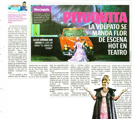 Por primera vez se monta en Chile la reescritura contemporánea y turbulenta que la legendaria dramaturga inglesa Sarah Kane hizo del mito de Fedra. Dirige Francisco Krebs y actúa Paola Volpato.