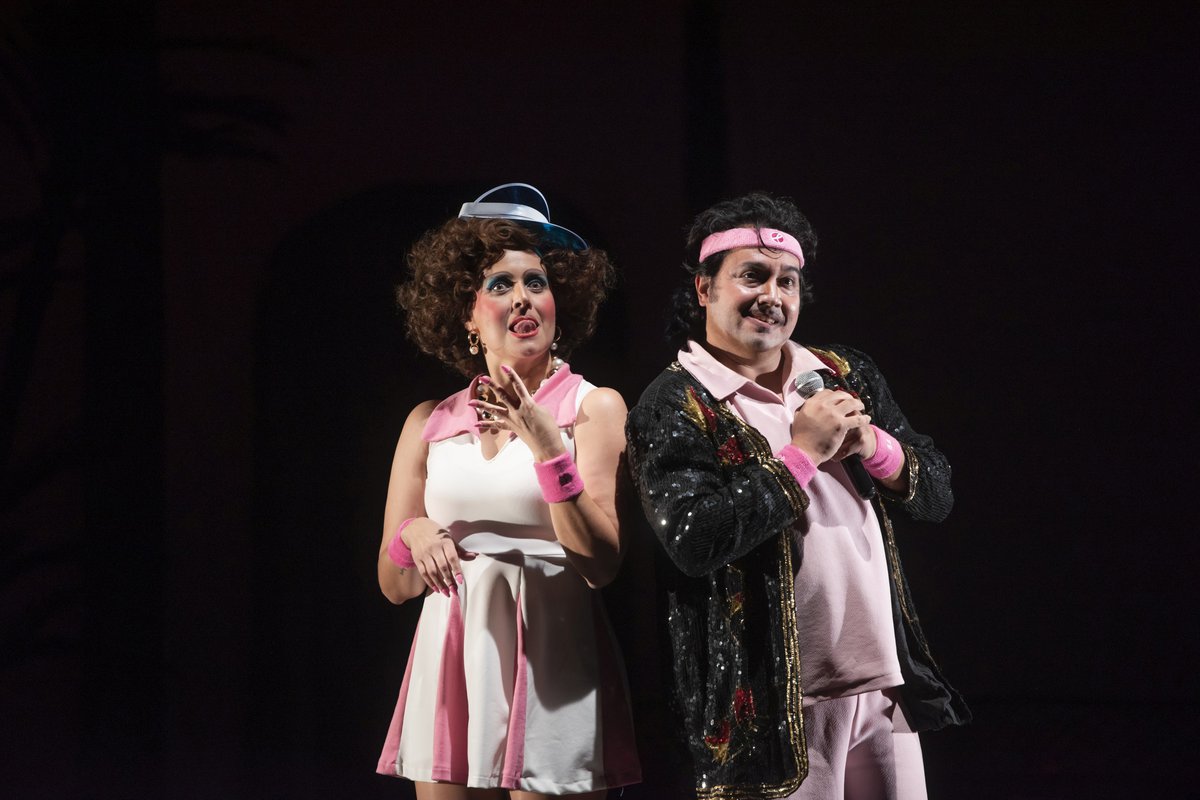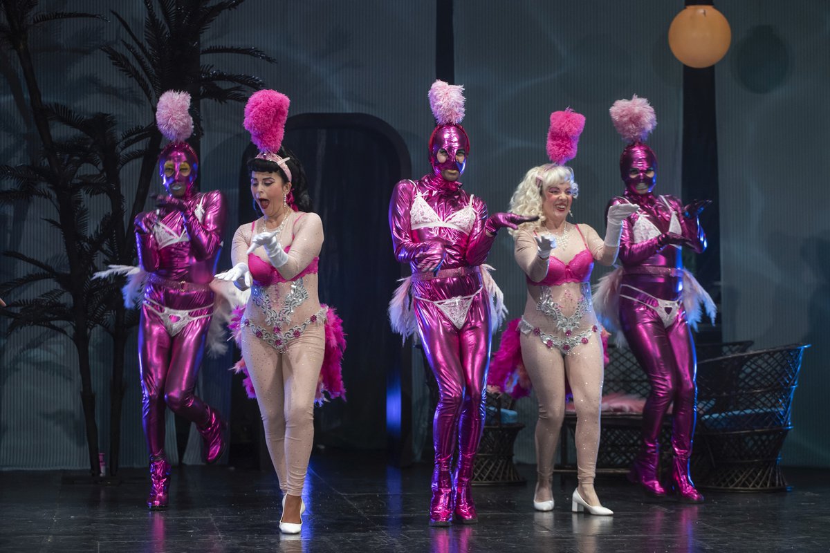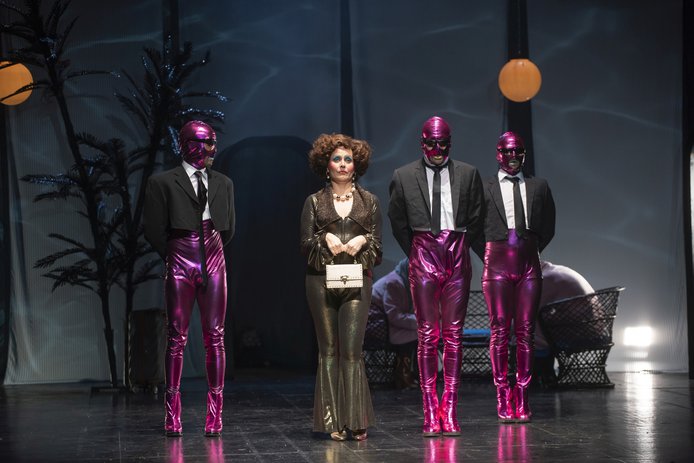 La compañía utiliza una estética de ciencia ficción inspirada en un Miami beach tropical. Colores rosado, verdes y amarillos, guayaberas, piñas y martinis matizan la sátira que protagonizan los trece artistas en escena y que contrasta con un oscuro pasado. Así, vemos a una Lucía Hiriart en abrigo de piel y anteojos angulosos como una diva decadente atrapada en la obsesión por rejuvenecer. “Es un personaje súper difícil—cuenta Natalia Valdebenito— tuve que desafiar el lado oscuro que todos tenemos. Pero junto a la ayuda del libro de Alejandra, mi propia investigación y escuchar su voz, ha sido posible. No quieren saber los sueños que tengo”.