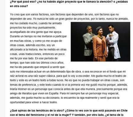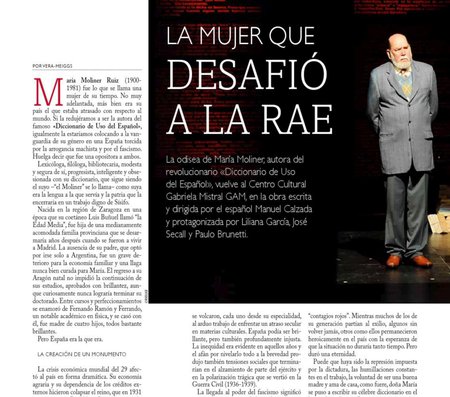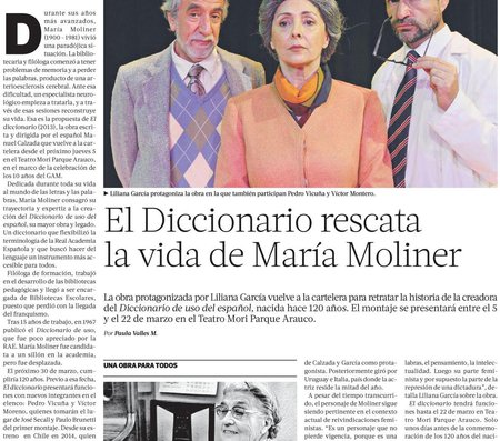 La obra escrita por el español Manuel Calzada debutó internacionalmente el año 2014 en GAM en un montaje dirigido por su propio autor y con Liliana García Sosa en el rol de Moliner. Tras una exitosa temporada la obra vuelve con el Ciclo GAM 10 años, tras haberle otorgado a su autor el Premio Nacional de Literatura Dramática.