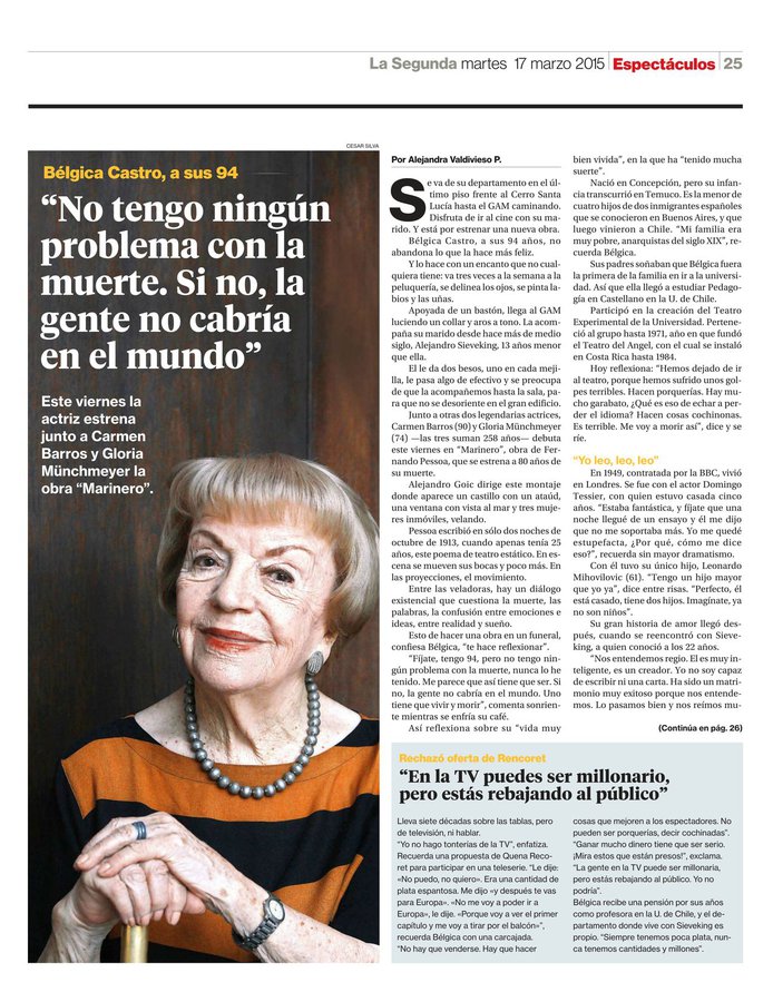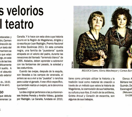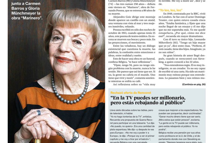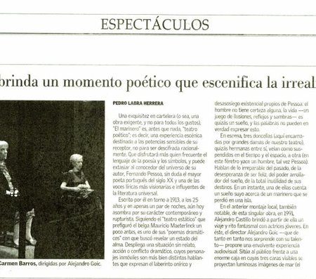 Un castillo con un ataúd. Una ventana con vista al mar. Tres mujeres inmóviles, velando. En escena se mueven sus bocas y poco más. En las proyecciones, el movimiento. Son Gloria Münchmeyer, Carmen Barros y Bélgica Castro interpretando a las tres veladoras de El Marinero, obra que el poeta portugués Fernando Pessoa escribió en sólo dos noches de octubre de 1913, cuando apenas tenía 25 años.