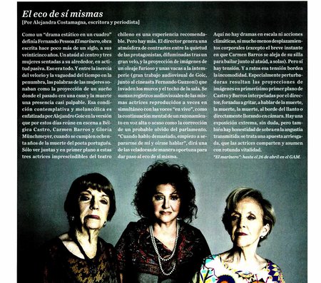 La obra de teatro estático de Fernando Pessoa se estrena a 80 años de la muerte del gran poeta portugués. Alejandro Goic dirige a un legendario trío de actrices: Bélgica Castro, Carmen Barros y Gloria Münchmeyer.
