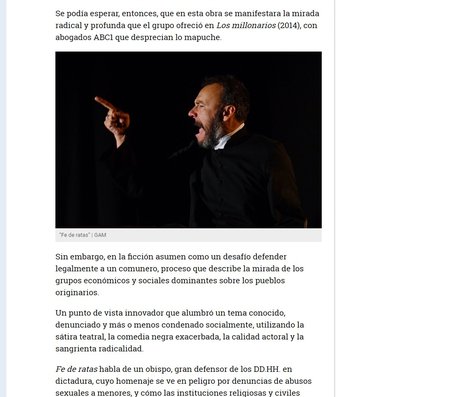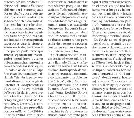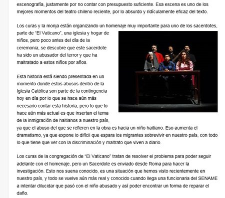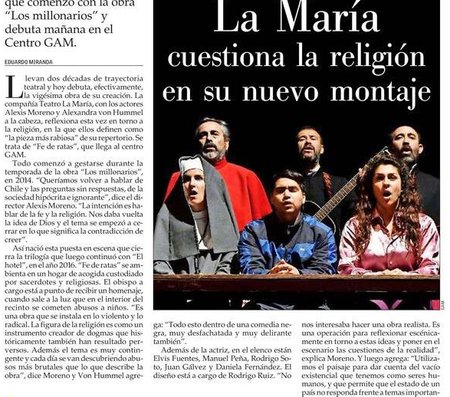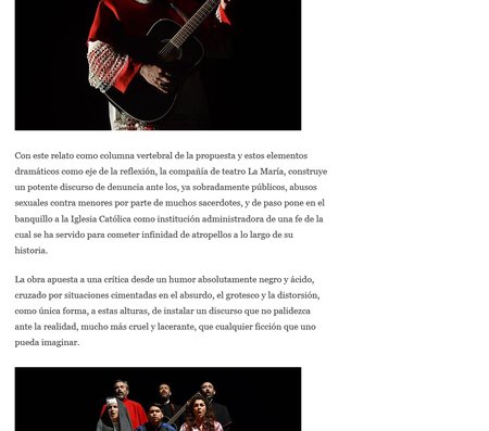 Una comedia negra escrita y dirigida por Alexis Moreno sobre los abusos a menores en la Iglesia católica y el SENAME. Estreno de la compañía Teatro La María.
