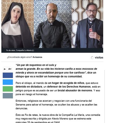“Un par de toqueteos en el culo y arman la grande. En su vida les hicieron cariño a esos mocosos de mierda y ahora se escandalizan porque uno fue cariñoso”. La frase es de un obispo que está a punto de ser homenajeado por su comunidad. A pesar de su trabajo al mando de un hogar de acogida para niños, de su pasado detenido en dictadura y defendiendo los derechos humanos, el homenaje peligra porque el obispo es un brutal abusador de niños. Pero los religiosos incluso negociarán con una funcionaria de un hogar del SENAME con tal de que resulte el homenaje, los abusos sigan siendo ocultados y las denuncias silenciadas. Eso es Fe de ratas, la nueva obra de la compañía Teatro La María.