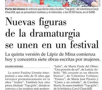 La quinta versión del festival de dramaturgia de mujeres presenta también las lecturas dramatizadas de seis obras, seleccionadas en una convocatoria abierta a la que postularon más de 50 textos. El festival tendrá además un taller de fanzine y autopublicación a cargo de Vicenta Mendoza, de Fanzinombre, el 14 de diciembre, de 10 a 13 horas. El taller es con adhesión voluntaria, previa inscripción en contacto@lapizdemina.cl