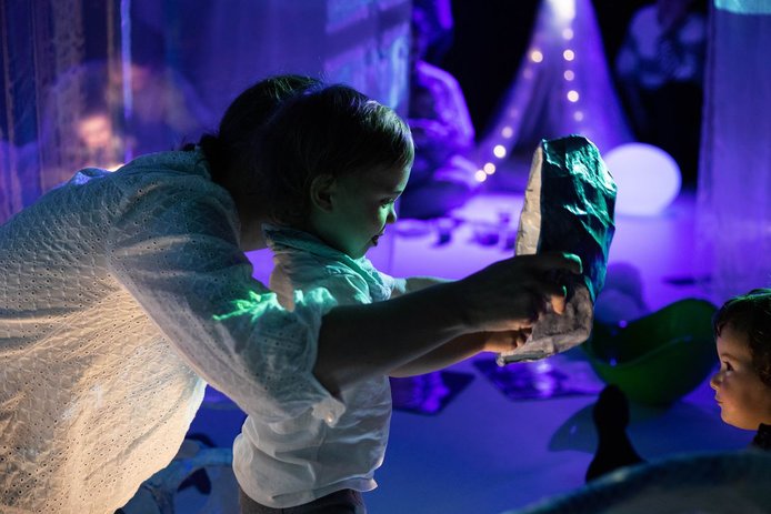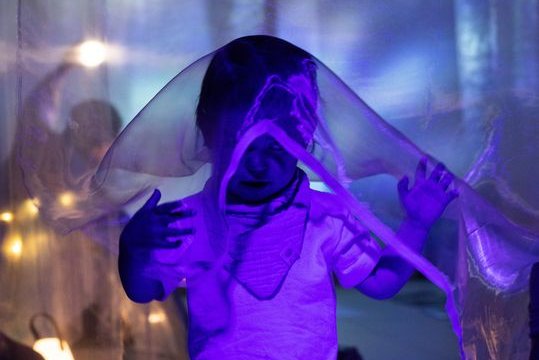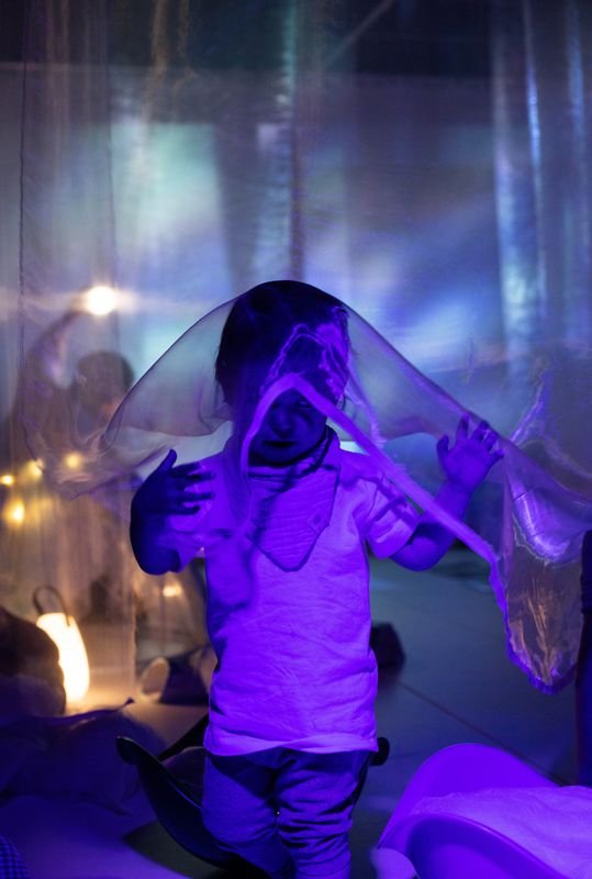 Participando a través del juego, con luces, sonidos, sombras y espacios creados para descubrir los sentidos con la temática del agua, las niñas, niños y sus familias podrán hacer un viaje creativo y lúdico donde poder intervenir distintos espacios, descubrir posibilidades de movimiento, experimentar texturas, imaginar el fluir y descubrir universos propios compartidos.
