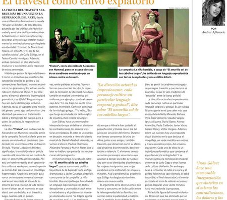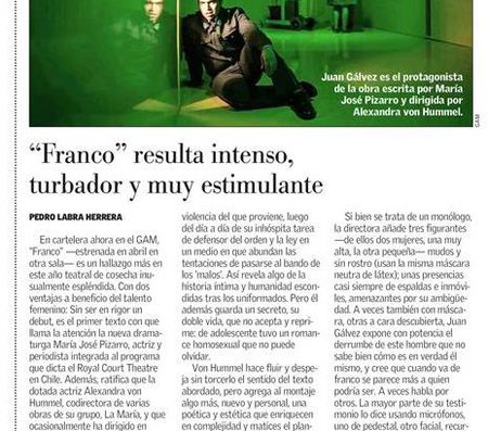 “No sé cuándo supe que quería ser lo que soy, señorita”, dice Franco, un joven carabinero en el encierro. Franco recuerda fragmentadamente distintos episodios que arman la historia tras el crimen que lo tiene recluido. Eso ocurre en esta obra escrita por María José Pizarro y dirigida por Alexandra von Hummel, un trabajo que indaga en identidad de género, orientación sexual y represión.