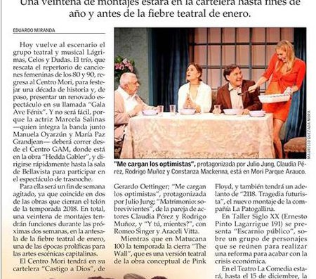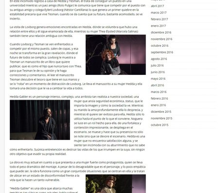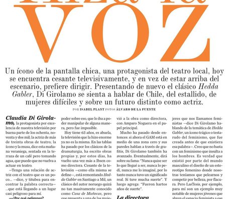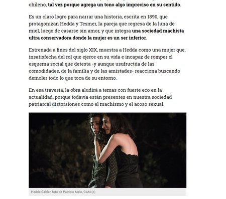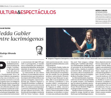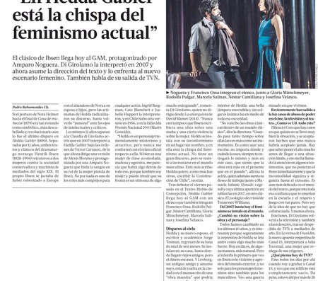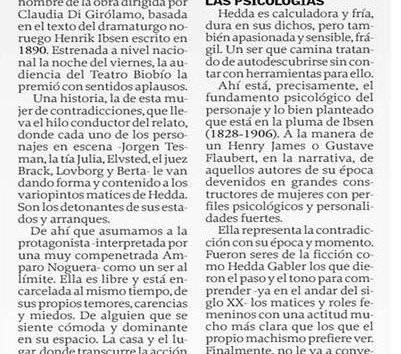 Si Di Girolamo le encargó a Moreno una nueva versión del texto de Henrik Ibsen, fue para rescatar lo cotidiano de las conversaciones. “Es el interior de los personajes lo que se remueve y convulsiona, no las palabras”, dice la directora. Pero la historia sigue siendo la misma: Tras una larga luna de miel, Hedda se instala con su marido (Francisco Ossa) en su nueva casa. Ahí llegan familiares (Gloria Münchmeyer) y amigos (Marcela Salinas, Rolo Pulgar) a los que desprecia. Y reaparece su antiguo amor (Néstor Cantillana), un escritor que lucha con el alcohol y sus demonios, mientras Hedda lo empuja a entregarse a ellos.