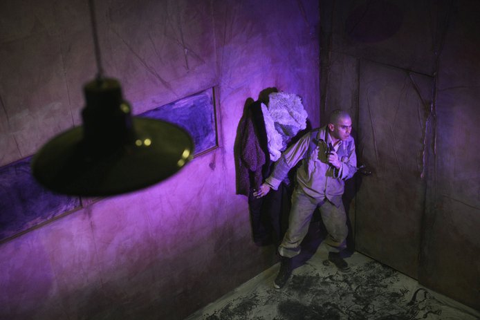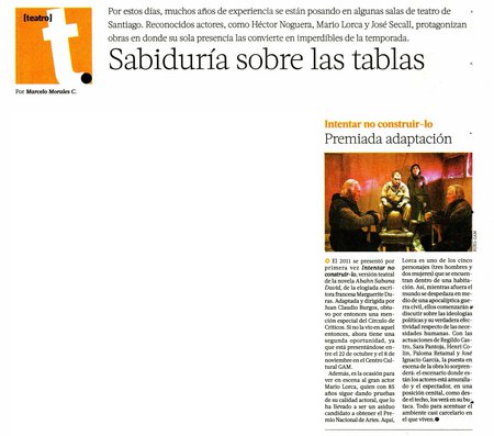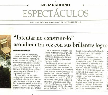 La ubicación del público es atípica: desde la altura los espectadores observan la escena. Entre muros, frío y penumbra se mueve un experimentado elenco encabezado por Regildo Castro, Mario Lorca y Sara Pantoja. Es una noche en el campo en medio de una guerra, las coordenadas son difusas y la acción está marcada por el suspenso. Una mujer y un hombre buscan matar a un judío. Ese es el punto de partida de Intentar no contruir-lo, la elogiada adaptación de la novela Abahn Sabana David, de la escritora francesa Marguerite Duras.