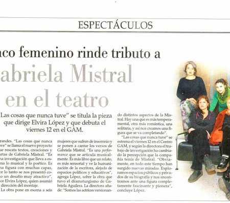 La obra es dirigida por Elvira López Alfonso y tiene dramaturgismo de Gabriela Aguilera. El montaje se estrenó con éxito el 2015 en GAM, como parte de las celebraciones por los 70 años del Premio Nobel a Mistral.