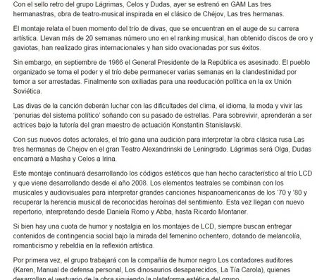 Creado en conjunto por el trio de actrices, este montaje cuenta tres momentos en la vida de Lágrimas, Celos y Dudas. El primero durante su éxito ochentero en Chile bajo el régimen militar. El segundo en su exilio en Rusia, a donde parten luego que el presidente del país muriera en un atentado. Y el tercero, su presente maduro en el Santiago actual.
