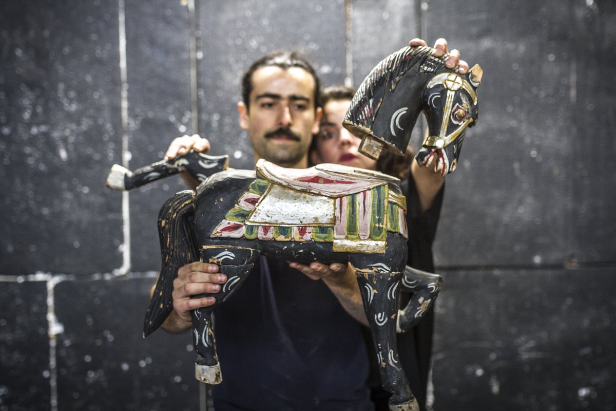 Todo esto sucede en un espacio aparentemente vacío, que se va transformando gracias al lanzamiento de cuchillos y animación de objetos. En conjunto con el dibujo y la música, los protagonistas crearán atmósferas, imágenes y sensaciones para divagar sobre la creación del caballo.