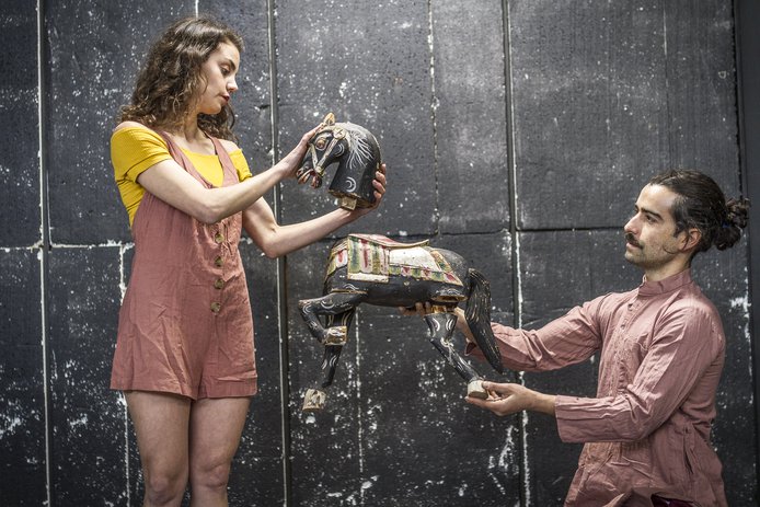 Juan Pablo Corvalán y Javiera Osorio dirigen esta obra de circo contemporáneo inspirada en el fragmento del caballo del libro “Lipika”, del escritor y premio Nobel indio Rabindranath Tagore. En escena, un hombre y una mujer ven de noche en el firmamento claramente dibujado por las estrellas un caballo. Utilizarán objetos que los transformarán a ellos y al espacio para hacer aparecer y desaparecer al caballo, se transformarán en él, serán su cuerpo y su voz; su fuerza y su peso, lo veremos correr y caer exhausto.